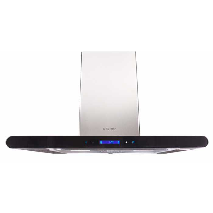 Hotte de cuisinère à fixation murale.Boîte avec côtés arrondis et panneau frontal en verre au profil mince et épuré.