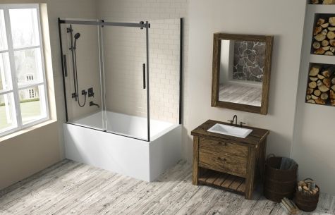 La porte de bain Hydria est tout en en transparence et simplicité. Avec ses deux panneaux bidirectionnels, elle permet en tout temps un accès à la robinetterie et à l'ensemble de la baignoire.