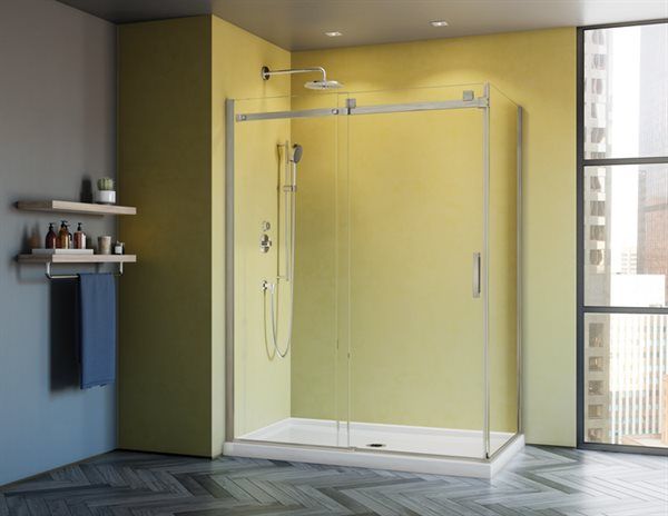 Porte de douche Skyline coulissante avec panneau fixe et panneau de retour (fermeture contre le panneau de retour) et drain central caché avec 2 brides de carrelage intégrées, par Fleurco.